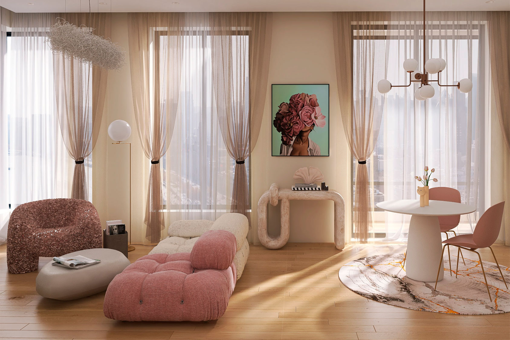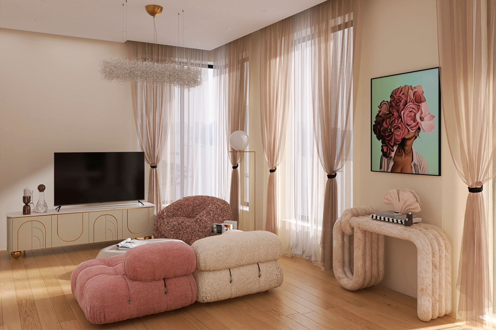За два дня мы воссоздали сцену гостиной, почти в том же виде, в котором ее сделал визуализатор в 3DS Max. Это было важно, потому что все остальные помещения, кроме гостиной были сделаны в 3DS Max и не должны были сильно отличаться от визуализаций гостиной. Наверное, именно это меня и напугало изначально. Более того, мы улучшили и проработали многие детали, благодаря которым проект заиграл более утонченно. Многие модели — это дизайнерские предметы мебели и осветительные приборы, которые пришлось покупать на 3ddd. Это диван Camaleonda by B&b Italia в расцветке Stella McCartney, это Nudo Console by Kelly Wearstler, забавная люстра Nuvola от Catellani & Smith.